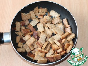 В сковороду, где жарился лук, добавить 1-2 ст. л. растительного масла. В подогретое масло положить порубленный чеснок и обжарить. Затем чеснок удалить из сковороды и на чесночном масле поджарить мелко нарезанные кусочки хлеба (у меня постные хлебцы). -