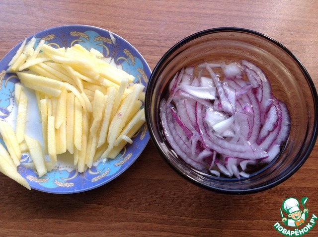 Лук нарезать полукольцами и замочить минут на 10 в маринаде: 1 ст. л. уксуса+ 1 ч. л. сахара и 100 мл холодной воды. Яблоко очистить и нарезать соломкой, сбрызгнуть лимонным соком.