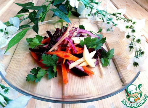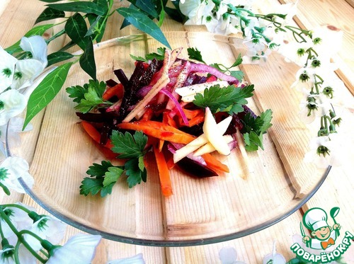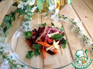 Отварную свеклу и морковь очистить и нарезать соломкой.