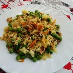Добавить к овощам все специи и соль, отварной рис и горошек. Тщательно перемешать и оставить еще на пару минут потушиться под крышкой. Готовый рис сервировать любимой зеленью ( у меня петрушка).