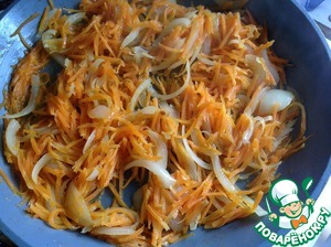 Лук нарезать полу кольцами, морковь натереть на крупной терке. Обжарить овощи до готовности в небольшом количестве растительного масла.