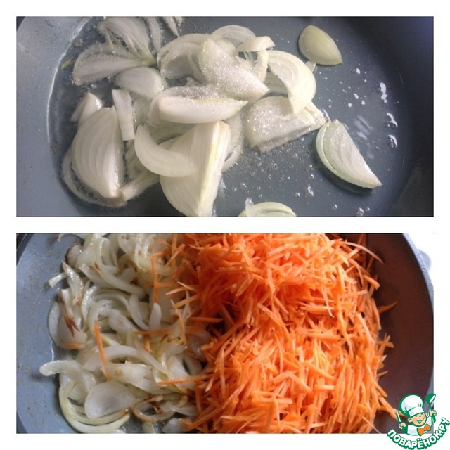 Лук нарезать полу кольцами и выложить в сковороду с растительным маслом и чайной ложкой сахара. Перемешать, и слегка карамелизовать лук. Морковь натереть на терке для корейской моркови и добавить к луку, влить воду, добавить соль. Перемешать и оставить тушить овощи под крышкой.