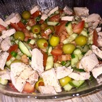 Все продукты режем крупными кусочками, количество продуктов определяем по своему вкусу. Заправляем салат смесью оливкового масла и сока лимона.