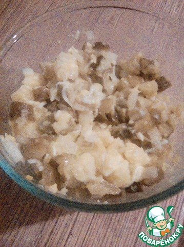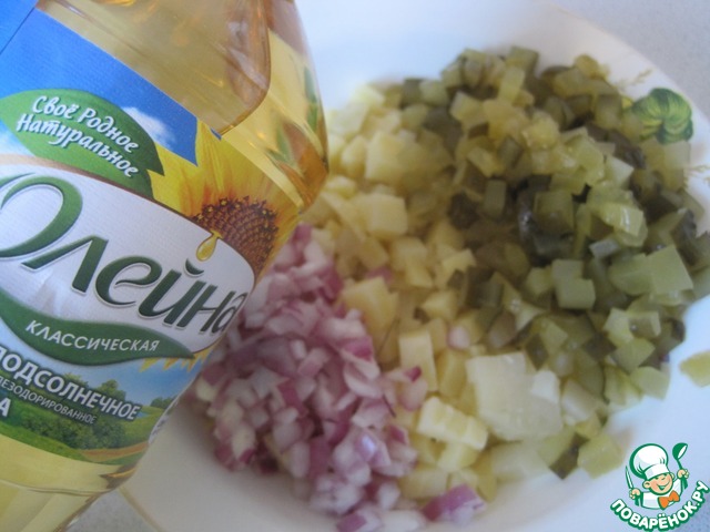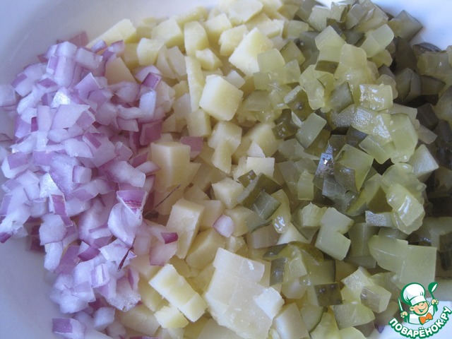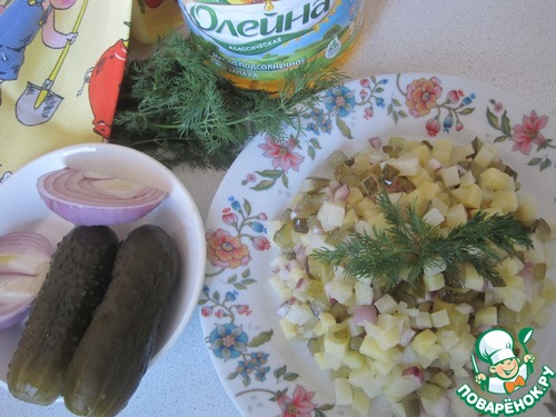 Добавляем ядреные соленые огурцы из бочки и лук.