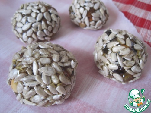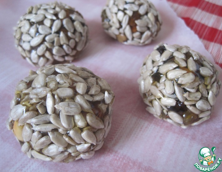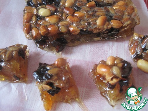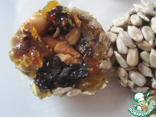Всыпаем в горячий мед сухофрукты, арахис и семечки. Перемешиваем.