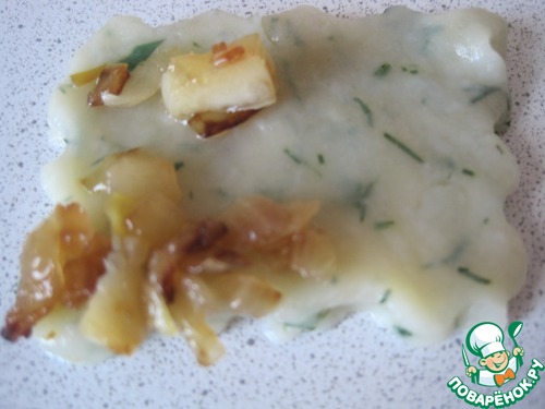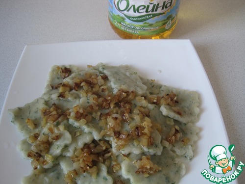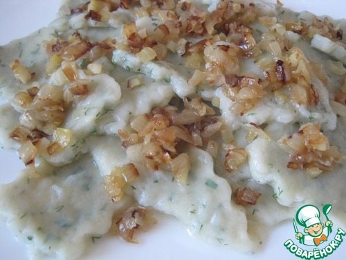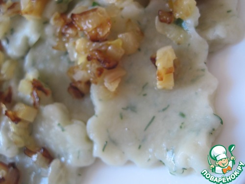Вкусные, быстрые вареники для ленивых. Тесто готовится без яиц из картофеля, муки и зелени. Едят эти вареники с золотистым поджаренным луком.