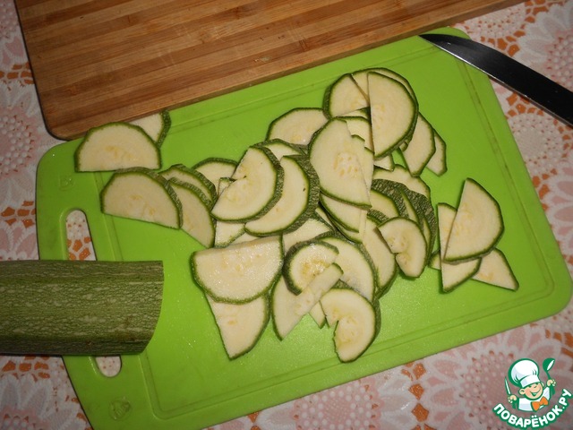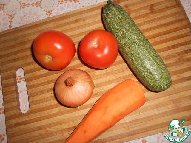Добавить нарезанный кабачок, готовить ещё 5 минут. Затем добавить помидор, посолить, поперчить, готовить под крышкой на небольшом огне 10 минут.