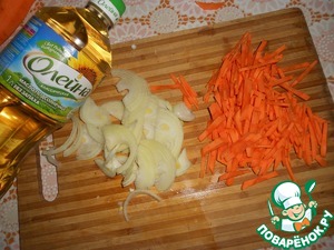 Луковицу очистить, нарезать полукольцами. Морковь очистить, нарезать соломкой.