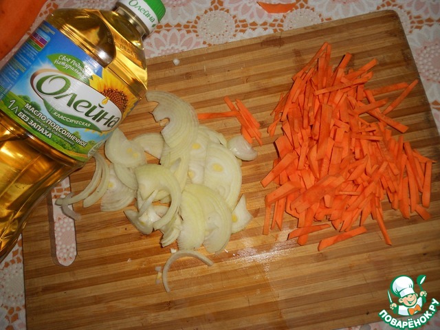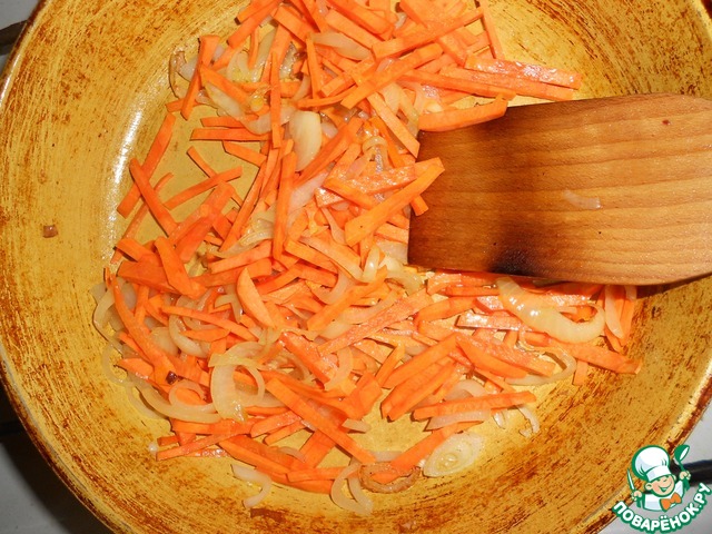 На сковороде разогреть растительное масло "Олейна", подрумянить лук. Добавить морковь, обжаривать 5 минут.