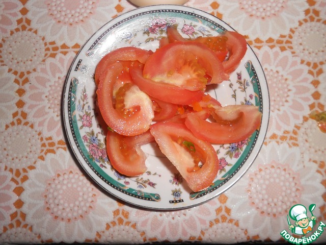 На помидоре сделать крестообразный надрез, ошпарить кипятком и снять кожицу. Нарезать помидор на небольшие дольки.