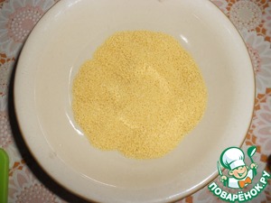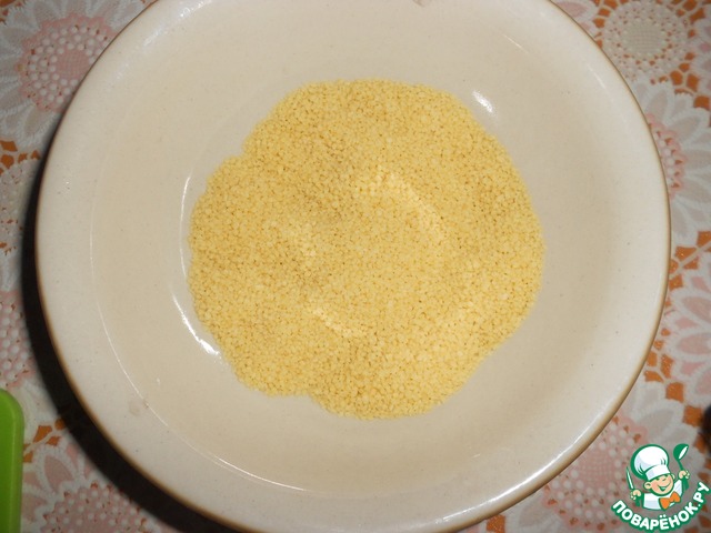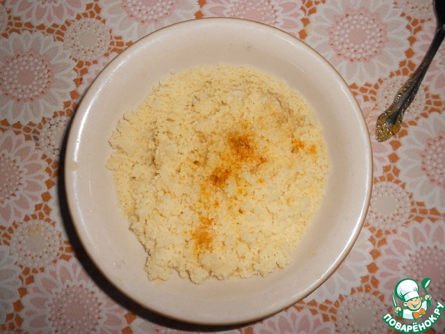 Кускус залить кипятком, накрыть крышкой и оставить на 5-7 минут.