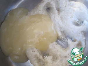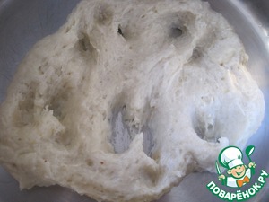 Добавляем муку и быстро перемешиваем, тесто очень долго не месим, т. к. оно становиться затяжным. Тесто получается мягким, липким.