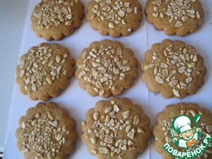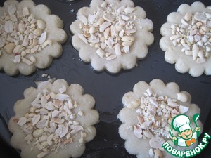 Кладем на противень посыпаем очищенным, дробленным арахисом, немного вдавливаем арахис ладонью.