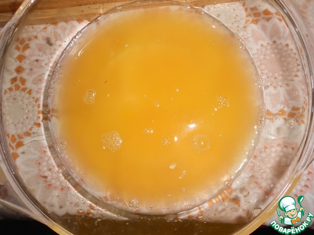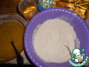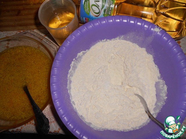 Добавить к апельсиновому соку жидкий мёд, сахар, растительное масло Олейна, перемешайте. Муку перемешайте с разрыхлителем и щепоткой соли.