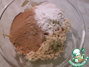 Натереть на крупной терке картофель и лук. Смешать с растительным маслом, крахмалом, мукой, сухарями, тимьяном. Посолить, поперчить.