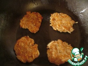 Теперь готовим драники. Если выделилось много жидкости, ее нужно хорошенько отжать, выложив массу в дуршлаг. Разогреть сковороду и выкладывать тесто небольшими порциями. Обжаривать по 3-4 минуты с каждой стороны. У меня картофельная масса получилась плотная, жидкости не было, драники я лепила руками.