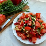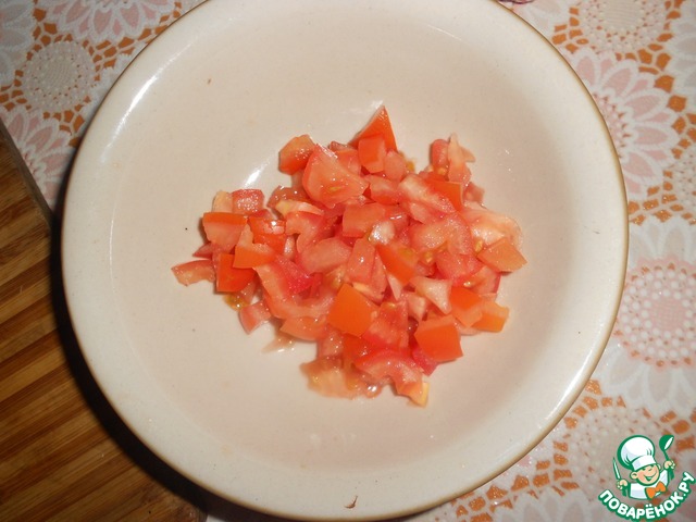 Сладкий перец нарезать кубиками, луковицу-полукольцами. Зелень мелко нарезать.