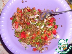Отварную чечевицу остудить, добавить подготовленные овощи, зелень. Полить заправкой и перемешать.