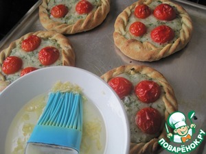Горячие ватрушки взбрызгиваем чесночным маслом.