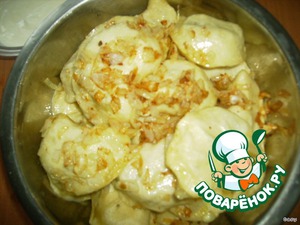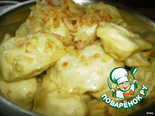 Готовые вареники выкладываем в кастрюльку с жареным луком и маслом, накрываем крышкой (периодически кастрюльку встряхиваем).
