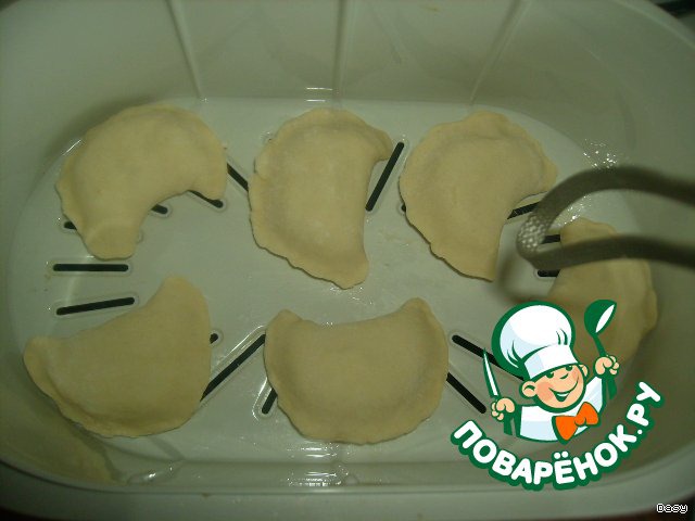 Начинку кладем на лепёшку, защипываем края и укладываем в пароварку.