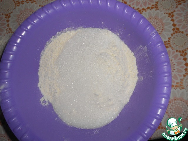 Муку просеять, добавить соду, соль, сахар, перемешать.