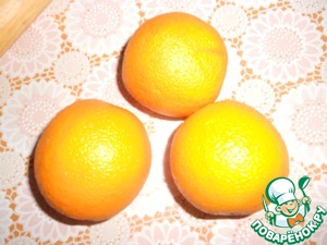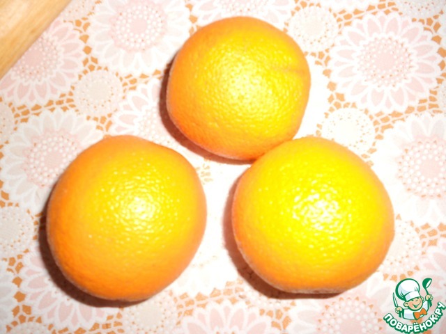 Апельсины вымыть. С одного апельсина снять кожуру. Два апельсина нарезать с кожурой, третий-очищенный.