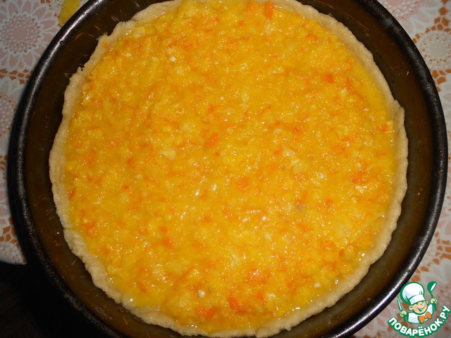 Вынуть тесто из холодильника, заполнить пирог начинкой.