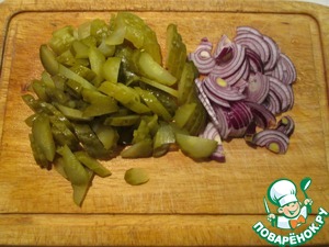 Лук очистить, порезать полукольцами. Огурцы нарезать ломтиками.