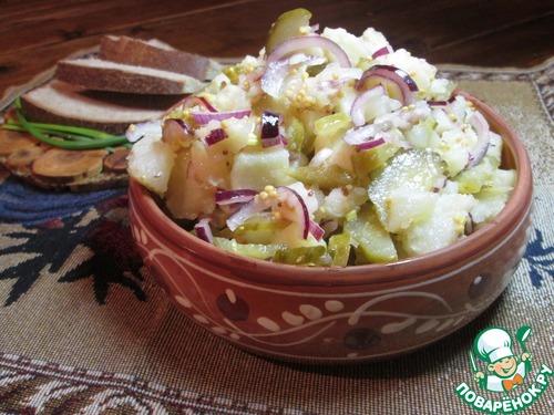 Остывший картофель почистить, крупно порезать, добавить к луку и огурцам. Все хорошо перемешать, если необходимо добавить еще масла, дать настояться 10-15 минут. При подаче можно посыпать укропом.