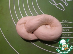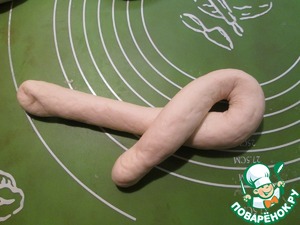 Сформировать крендели. Для этого сделать из колбаски петлю, а затем свободный край завести против часовой и заправить в петлю снизу.