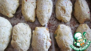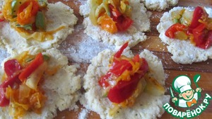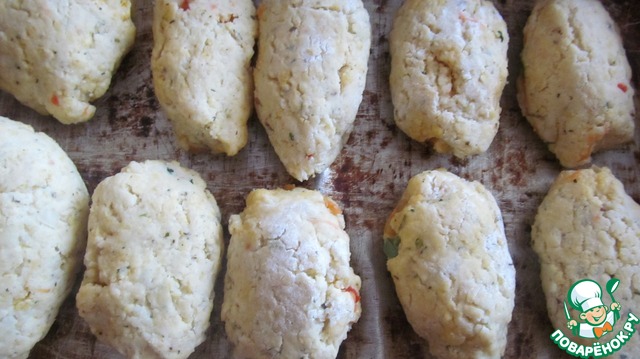 6. Тесто поделить на небольшие колобки, примять рукой, на середину положить начинку.