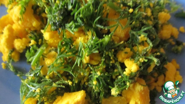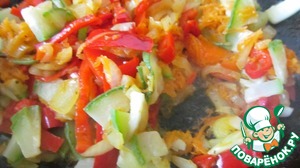 4. Для постной начинки обжарить лук, морковь, кабачок, красный болгарский перец, зелень.