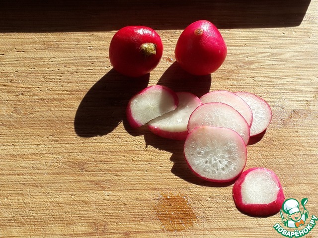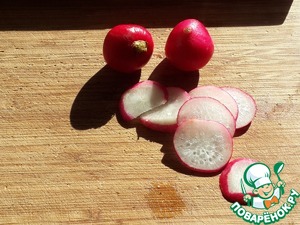 Тонкими ломтиками нарежьте редис