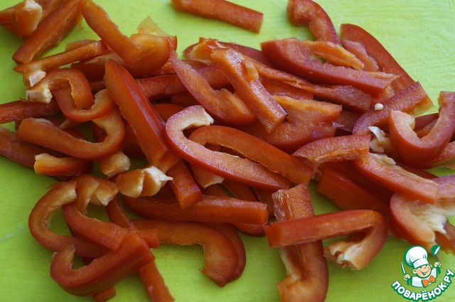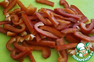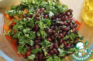 • В чаше перемешать болгарский перец, фасоль, томатную пасту и мелко рубленную зелень петрушки.