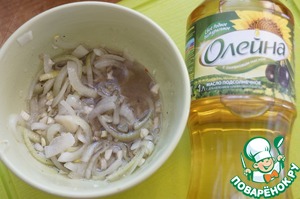 Лук нарезать тонкими полукольцами, обдать кипятком и дать полежать в нем пару минут, воду слить. К луку добавить уксус, подсолнечное масло, соль, перец черный молотый и мелко нарубленные зубчики чеснока. Дать настояться в течении 30 минут.