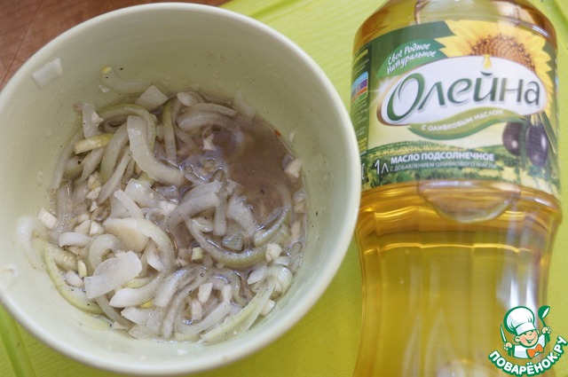 • Лук нарезать тонкими полукольцами, обдать кипятком и дать полежать в нем пару минут, воду слить. К луку добавить уксус, подсолнечное масло, соль, перец черный молотый и мелко нарубленные зубчики чеснока. Дать настояться в течении 30 минут.