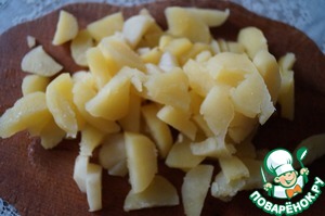 Картофель запечь в духовом шкафу и нарезать дольками пока он горячий