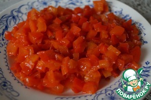 Консервированный болгарский красный сладкий перец нарезать мелкими кубиками (можно использовать Лечо)