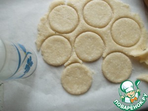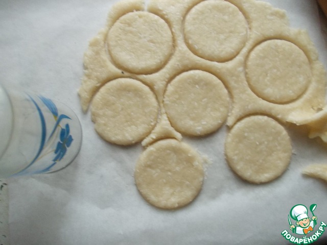 Раскатываем часть теста, подсыпаем на стол муки слегка, для легкости. Толщина не большая, как на вареники. С помошью стакана вырезаем печенюшки.