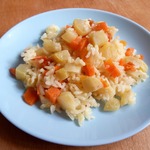 Когда овощи будут готовы добавляем в них рис и обжариваем еще 2-3 минуты на сильном огне. Получается очень вкусно!
