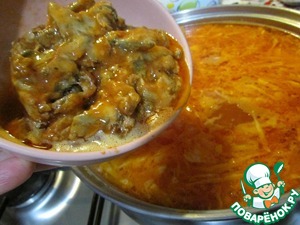 Затем в кастрюлю добавить зажарку. Перемешать и дать вновь закипеть.