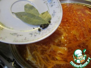 Положить лавровый лист и перец горошком. Попробовать на соль, если не хватает, добавить. Довести до кипения. И варить минут 5-7. Затем накрыть крышкой и оставить настаиваться 20 минут.