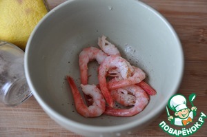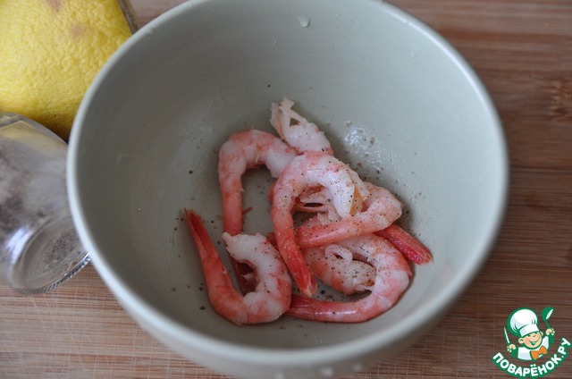 Для приготовления не постной добавки заранее берём креветки, даём им самостоятельно оттаять, чистим, сбрызгиваем соком лимона и посыпаем свежемолотой смесью перцев.