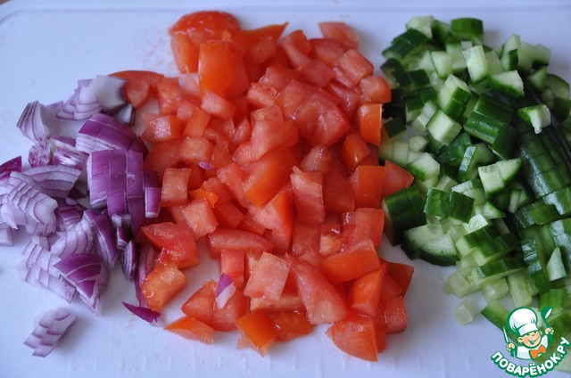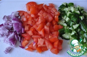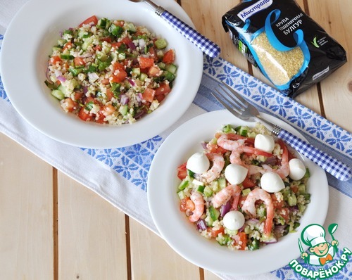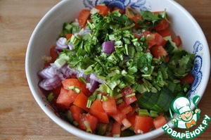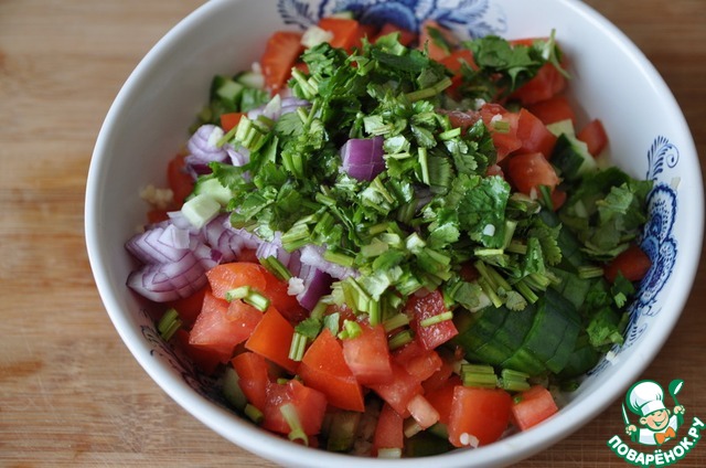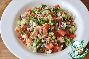Остывший готовый булгур взрыхляем деревянной ложкой. Добавляем порезанные овощи и рубленную зелень петрушки.