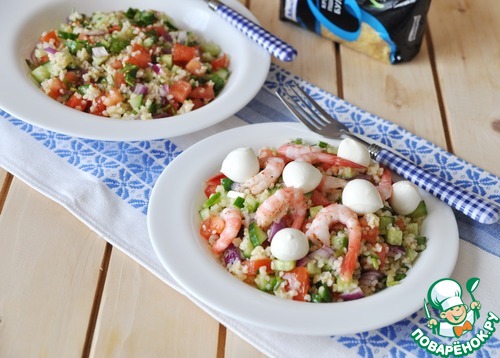 Во вторую часть кладём маринованные креветки и шарики моцареллы.