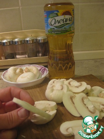 Шампиньоны помыть, почистить и нарезать поперек пластинками по 5 мм толщиной. Сначала я порезала на более тонкие пластинки примерно 2-3 мм., но попробовав готовые шампиньоны решила, что если их порезать потолще то они получатся сочнее, так и получилось!