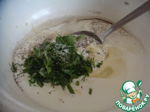 В сметану (крем фреш) добавляем мелко порубленный эстрагон или другую зелень (столовую ложку), солим и перчим, щедро вливаем оливковое масло и хорошо перемешиваем.