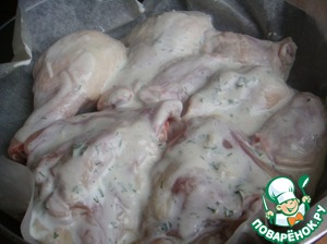 Оставляем на час промариноваться. У меня остался соус и я его еще распределила сверху по кускам. Жером сначала обжаривает курицу в хорошо разогретом оливковом масле, чтобы получилась хорошая корочка, а потом доводит до готовности в духовке. Я же запекала изначально в духовке вместе с луком (в разных формах, естественно). Получается очень вкусная сочная курица.