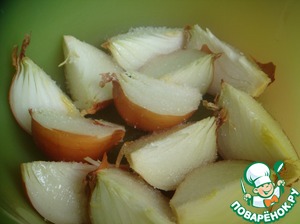 Итак, все очень просто. Лук вымыть, разрезать на четвертины (обязательно с кожурой). Солим, сахарим и поливаем оливковым маслом. Перемешать.